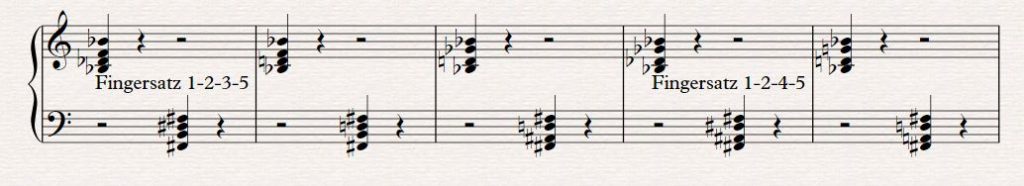 Die Fingersätze schreibe ich hier für die rechte Hand, sie gelten für die linke Hand auch, wenn man die Akkorde spiegelt. Der Fingersatz für c-f-a-c 1-2-4-5 gilt also auch für den spiegelverkehrten Akkord e-g-h-e (5-4-2-1) links.