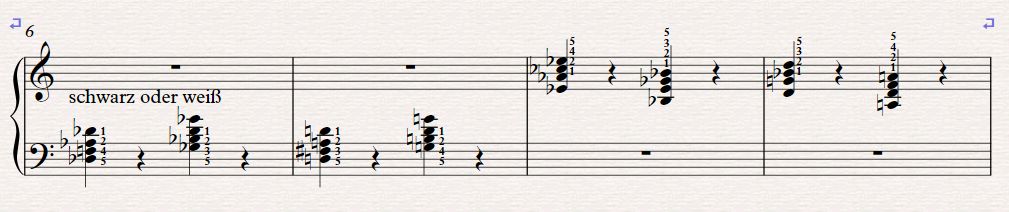 Die Grenze zwischen 1-2-3-5 und 1-2-4-5 liegt für die rechte Hand in den Quartsextakkorden in Moll. Wenn der 3. Ton eine schwarze Taste ist, nimmt man den 3. Finger, auf weißer Taste den 4. Finger, also 1-2-4-5 wie in Beispiel 2 es-as-ces-es oder a-d-f-a, 1-2-3-5- wie in Beispiel 2 b-es-ges-b und d-g-b-d. Für die linke Hand: Des-Dur 1. Lage des-f-as-des spiele ich mit 5-4-2-1, D-Dur 1. Lage d-fis-a-d mit 5-3-2-1. Das ist für einige meiner Studenten erstmal neu und gewöhnungsbedürftig, ich empfehle, es mal eine Zeit zu probieren.