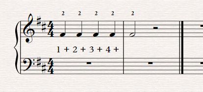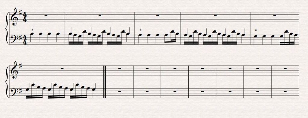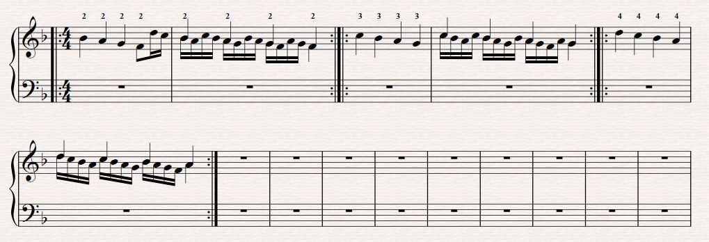 Dadurch wird der eine Finger unabhängig von den anderen. Er bewegt sich in seinem Tempo für die 4tel Noten, während die anderen Finger spielen. Wenn du bedenkst, dass du ohne Übung einen einzelnen Ton mit einem Finger ungefähr 6 mal pro Sekunde spielen kannst, und unabhängig davon spielen 3 oder 4 andere Finger noch dazwischen, kannst du dir das Potential dieser Übung vorstellen.